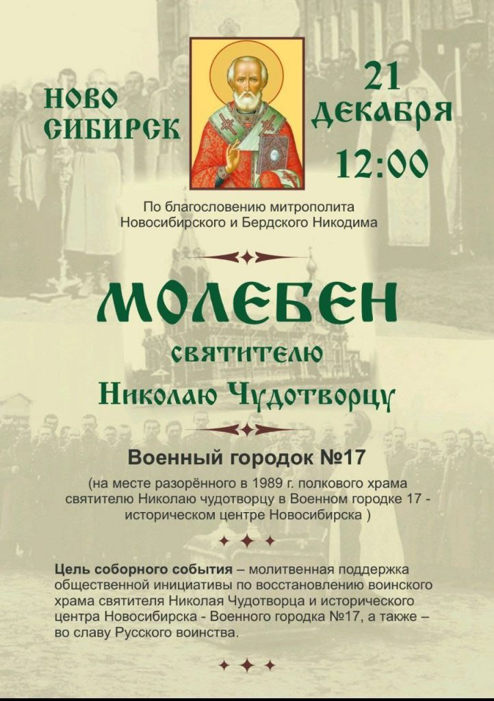 21 декабря 2025 года в 12:00 по благословению митрополита Новосибирского и Бердского Никодима состоится молебен в историческом центре города — Военном городке №17, на месте разорённого в 1989 году Воинского храма во имя святителя Николая Чудотворца.